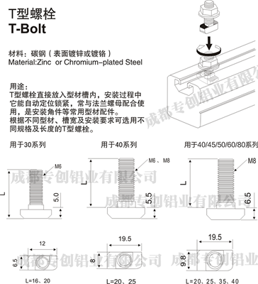 T型螺栓直接放入型材槽內(nèi),安裝過(guò)程中它能自動(dòng)定位鎖緊,常與法蘭螺母配合使用,是安裝角件等常用型材配件。根據(jù)不同型材、槽寬及安裝要求可選用不同規(guī)格及長(zhǎng)度的T型螺栓。