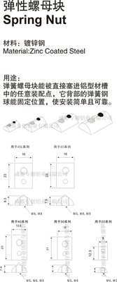 彈簧螺母塊能被直接塞進(jìn)鋁型材槽中的任意裝配點(diǎn),它背部的彈簧鋼球能固定位置,使安裝簡(jiǎn)單且可靠。