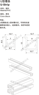 U型槽條放入型材槽內(nèi)后,可將有機(jī)玻璃等板材插入,起到緩沖、保護(hù)和密封等作用。