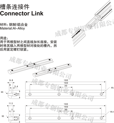 用于兩根型材之間直線加長(zhǎng)連接,安裝時(shí)將其插入兩個(gè)型材對(duì)接處的槽內(nèi),然后用緊定螺釘鎖緊。